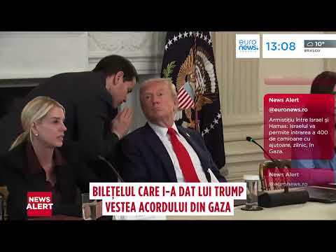 Președintele american, Donald Trump, se afla în plină dezbatere la Casa Albă, în momentul în care șeful diplomației americane i-a dat vestea unei înțelegeri privind un posibil acord de pace în Orientul Mijlociu. Marco Rubio i-a scris un bilețel, după care a urmat anunțul. Președintele s-a lăudat iar că a pus capăt mai multor conflicte, însă nu știe dacă va primi Premiul Nobel pentru pace.