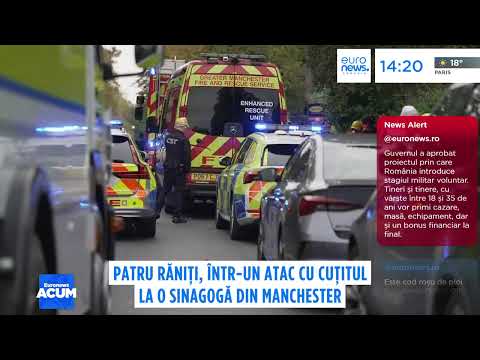 Poliția din Greater Manchester a declarat că un suspect a fost împușcat, iar patru persoane au suferit răni provocate atât de un vehicul, cât și de înjunghieri, la o sinagogă din Crumpsall, în nordul orașului.