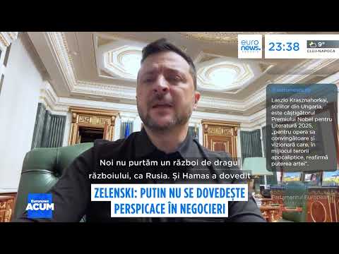 Putin nu se dovedește perspicace în negocieri, spune președintele Ucrainei, Volodimir Zelenski. Însă Rusia va fi constrânsă să pună capăt războiului, continuă el. Liderul de la Kiev a salutat acordul de pace în Gaza. Și s-a declarat încrezător că se va ajunge la pace și în Ucraina, cu ajutorul partenerilor internaționali.