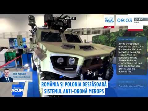 În direct la Euronews România, Ionuț Moșteanu, ministrul Apărării, a declarat că sistemul anti-dronă Merops a fost dat României de către Statele Unite și se află, în prezent, în teste pentru a fi integrat cu celelalte sisteme de apărare antiaeriană.